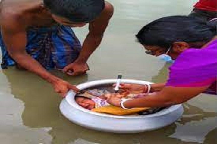 ভারতের পশ্চিমবঙ্গের দক্ষিণ ২৪ পরগনার জলমগ্ন কিছু এলাকা ডুবে গেছে বন্যার পানিতে। কিন্তু শিশুদের তো পোলিও টিকা খাওয়াতেই হবে। তাই স্বাস্থ্যকর্মীরা কোমর পানি, বুক পানিতে নেমেই টিকা খাওয়াচ্ছেন।
