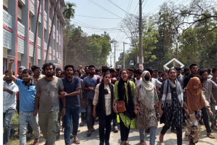 রোববার (১২ মার্চ) সকাল ১০টার দিকে গেটে তালা দেন তারা। এ ছাড়া ক্যাম্পাসের বিভিন্ন জায়গায় বিক্ষোভ মিছিল করছেন শিক্ষার্থীরা।