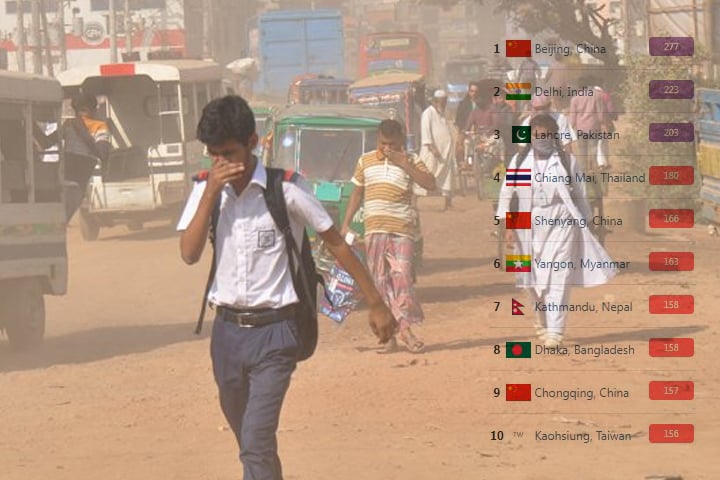 এদিন ২৭৭ স্কোর নিয়ে দূষিত বায়ুর শহরের তালিকার প্রথম স্থানে রয়েছে চীনের বেইজিং। ২২৩ স্কোর নিয়ে দ্বিতীয় স্থানে রয়েছে ভারতের দিল্লি। ২০৩ স্কোর নিয়ে তৃতীয় স্থানে রয়েছে পাকিস্তানের লাহোর। ১৮০ স্কোর নিয়ে চতুর্থ স্থানে রয়েছে থাইল্যান্ডের চিয়াং মাই। ১৬৬ স্কোর নিয়ে পঞ্চম স্থানে রয়েছে চীনের শেনিয়াং।
