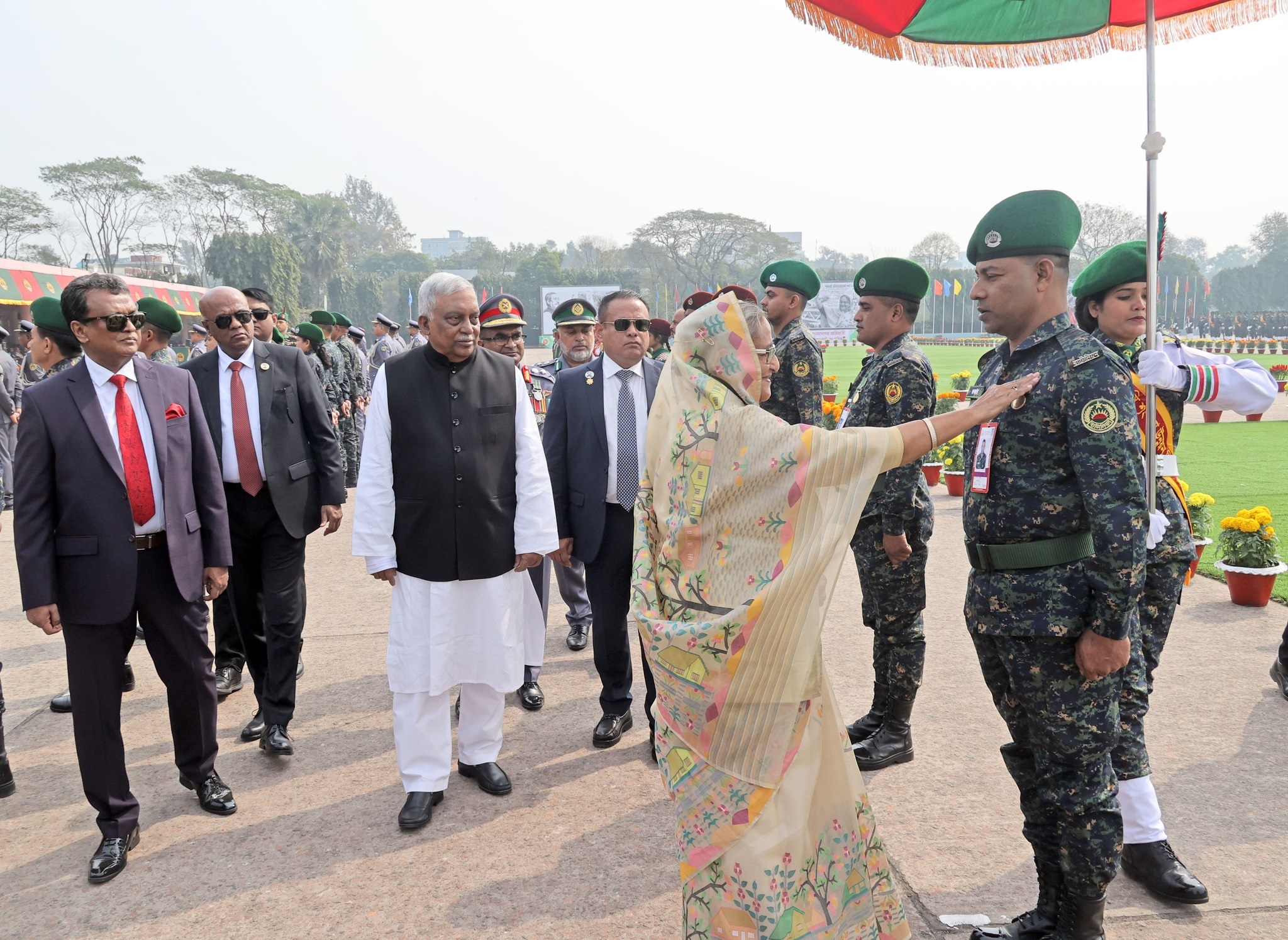 প্রধানমন্ত্রীকে সশস্ত্র সালাম জানায় আনসার বাহিনীর একটি চৌকস দল। একটি খোলা জিপে করে তিনি প্যারেড পরিদর্শন করেন। প্রধানমন্ত্রী কুচকাওয়াজের পর কৃতিত্বপূর্ণ কাজের স্বীকৃতি হিসেবে ১৮০ জন আনসার সদস্যদের পদক পরিয়ে দেন।