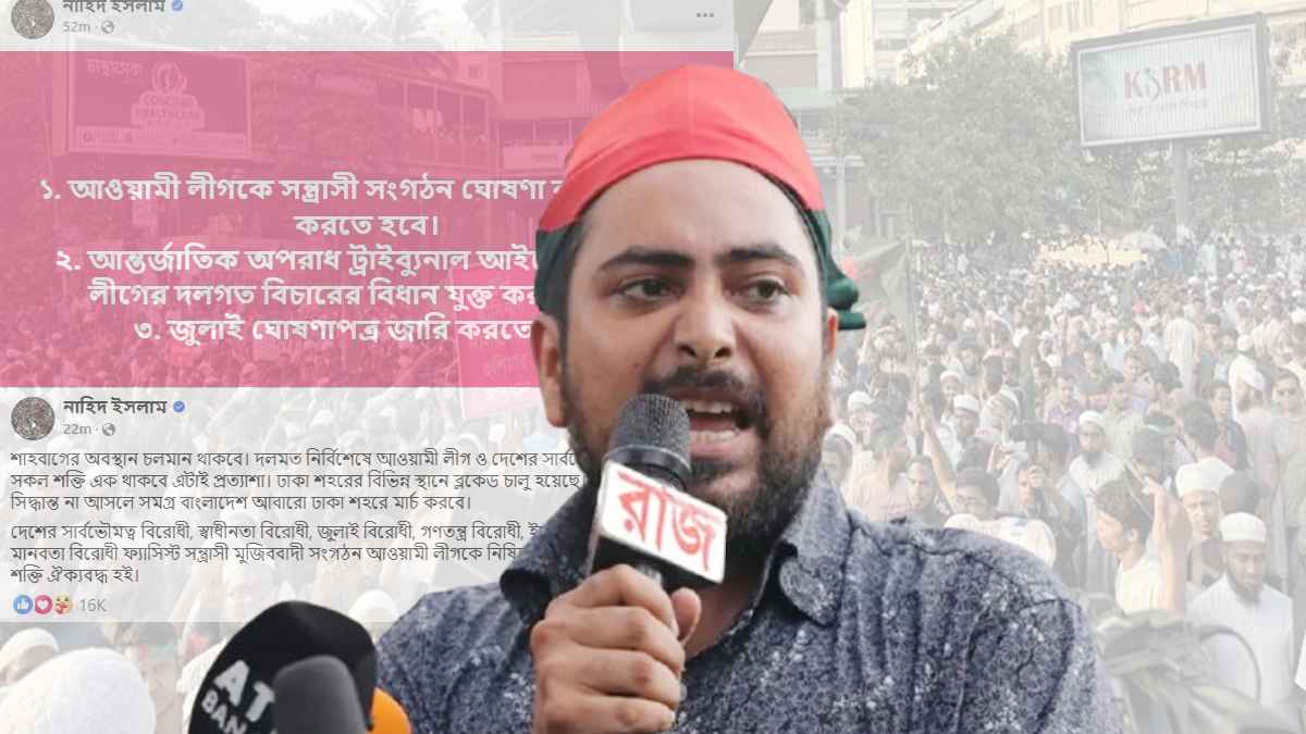 নাহিদের তিনটি দাবি হলো- আওয়ামী লীগকে সন্ত্রাসী সংগঠন ঘোষণা করে নিষিদ্ধ করতে হবে, আন্তর্জাতিক অপরাধ ট্রাইব্যুনাল আইনে আওয়ামী লীগের দলগত বিচারের বিধান যুক্ত করতে হবে এবং জুলাই ঘোষণাপত্র জারি করতে হবে।