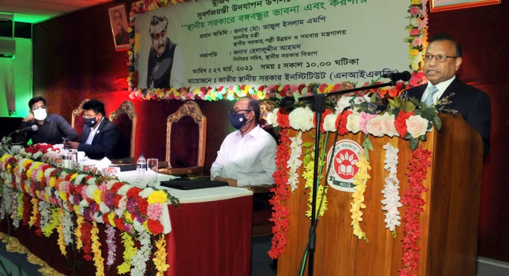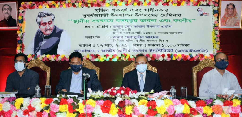 শনিবার(২৭ মার্চ) রাজধানীর আগারগাঁওয়ে জাতীয় স্থানীয় সরকার ইনস্টিটিউট আয়োজিত মুজিব শতবর্ষ এবং স্বাধীনতার সুবর্ণজয়ন্তী উদযাপন উপলক্ষে ‘স্থানীয় সরকারে বঙ্গবন্ধুর ভাবনা এবং করণীয়’ শীর্ষক সেমিনারে প্রধান অতিথির বক্তব্যে তিনি একথা বলেন।